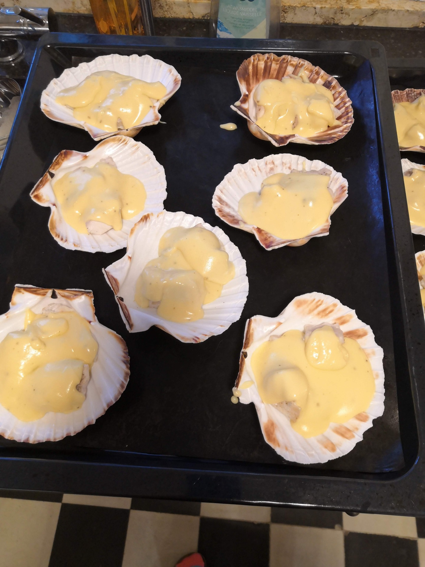 De vis is heerlijk. Lekker klassiek gepresenteerd in een Sint-Jakobsschelp (het oog wil ook wat). Perfect gegaarde vis in een zalige saus van fond, room, boter en eierdooiers. In de oven ging er nog wat kaas op en nadien strooiden we rijkelijk met verse peterselie en zelfgepelde Noordzeegarnalen. Ne mens gaat van minder klagen.