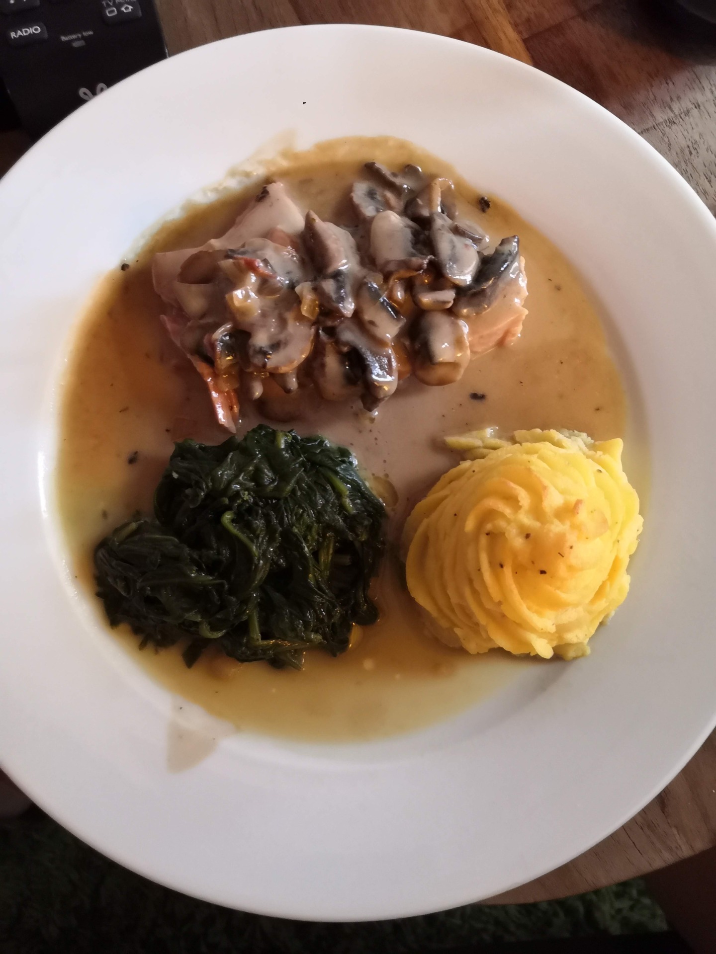 Het is kerst dus het mag al eens iets meer zijn. We besluiten om als voorgerecht te kiezen voor: filets de poisson gratinés a la parisienne. Het hoofdgerecht bestaat uit: Jambon braisé morvandelle, begeleidt door pommes duchesses en epinards au jus. Feestelijk afsluiten doen we met Crêpes Suzette.